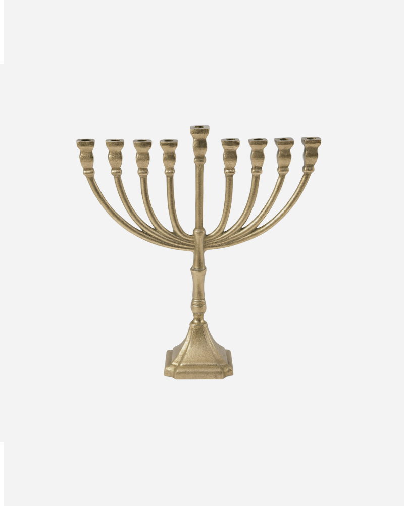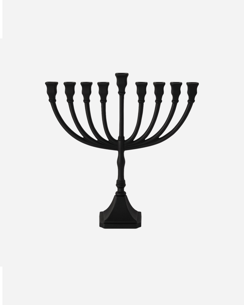 חנוכייה קלאסית בעיצוב אלגנטי, עשויה מתכת בגוון זהב /שחור עם גימור מטאלי עדין.