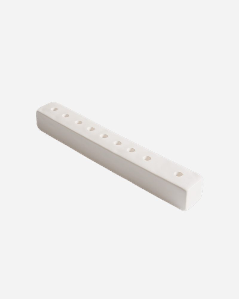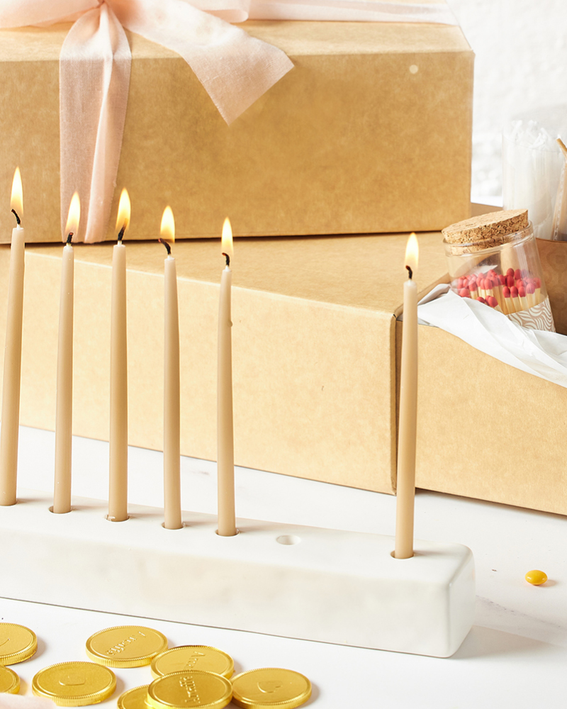 חנוכייה לבנה מעוצבת מקרמיקה בעיצוב נקי, עם מראה אלגנטי ופשוט, מושלמת לחג.