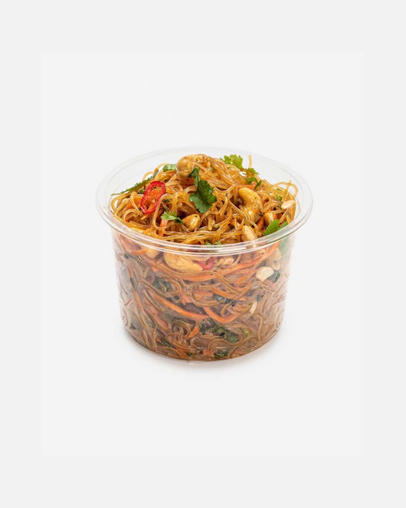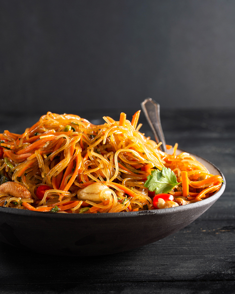סלט בסגנון אסייתי עם אטריות שעועית, גזר, פלפל אדום חריף, ג’ינג’ר, כוסברה, בזיליקום, סויה, סילאן וקשיו.