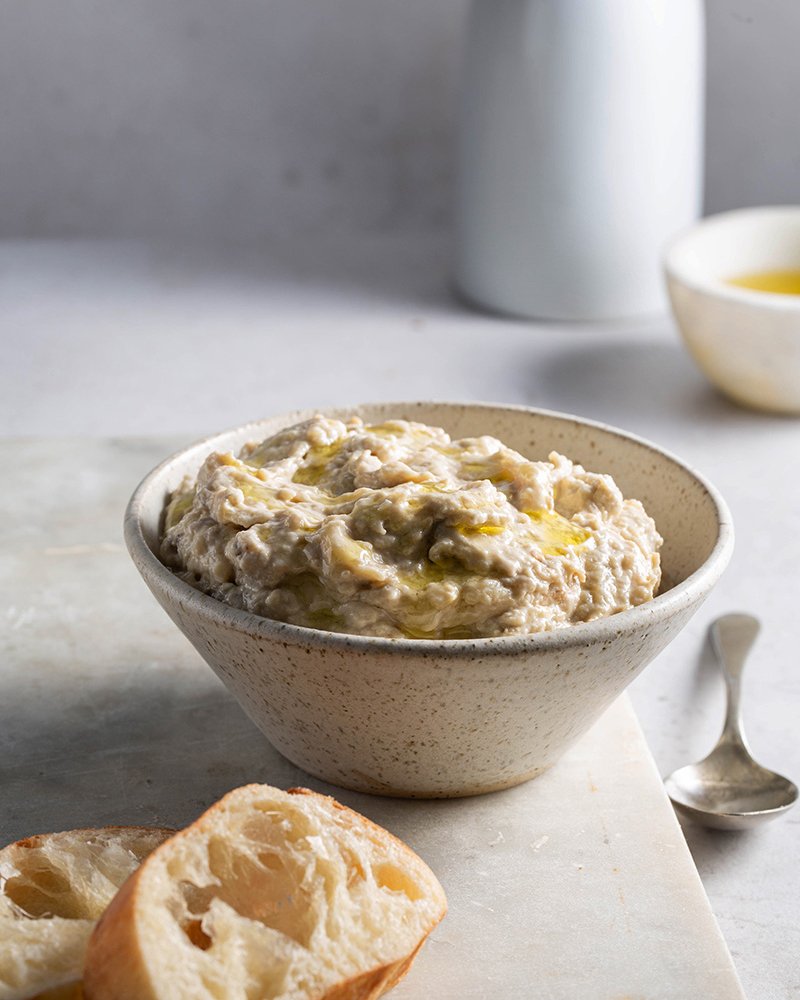 חצילים שרופים על אש גלויה עם טחינה, לימון ושום.