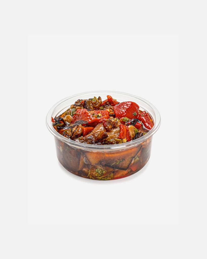 קוביות חציל אפוי ופלפלים קלויים בסגנון מזרחי.