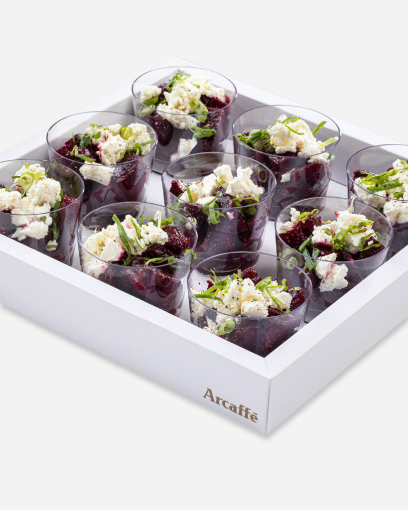 כוסות אישיות עם סלק בנוסח מרוקאי, גבינה בולגרית ובצל ירוק.