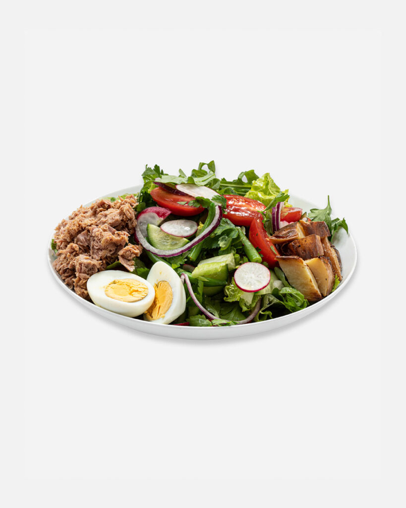 עגבניות שרי, מלפפון, נתחי טונה, ביצה קשה, עלי רוקט, חסה, תפוחי אדמה אפויים, שעועית ירוקה, בצל סגול, בצל ירוק, צנוניות, פטרוזיליה בוינגרט שמן זית ולימון.