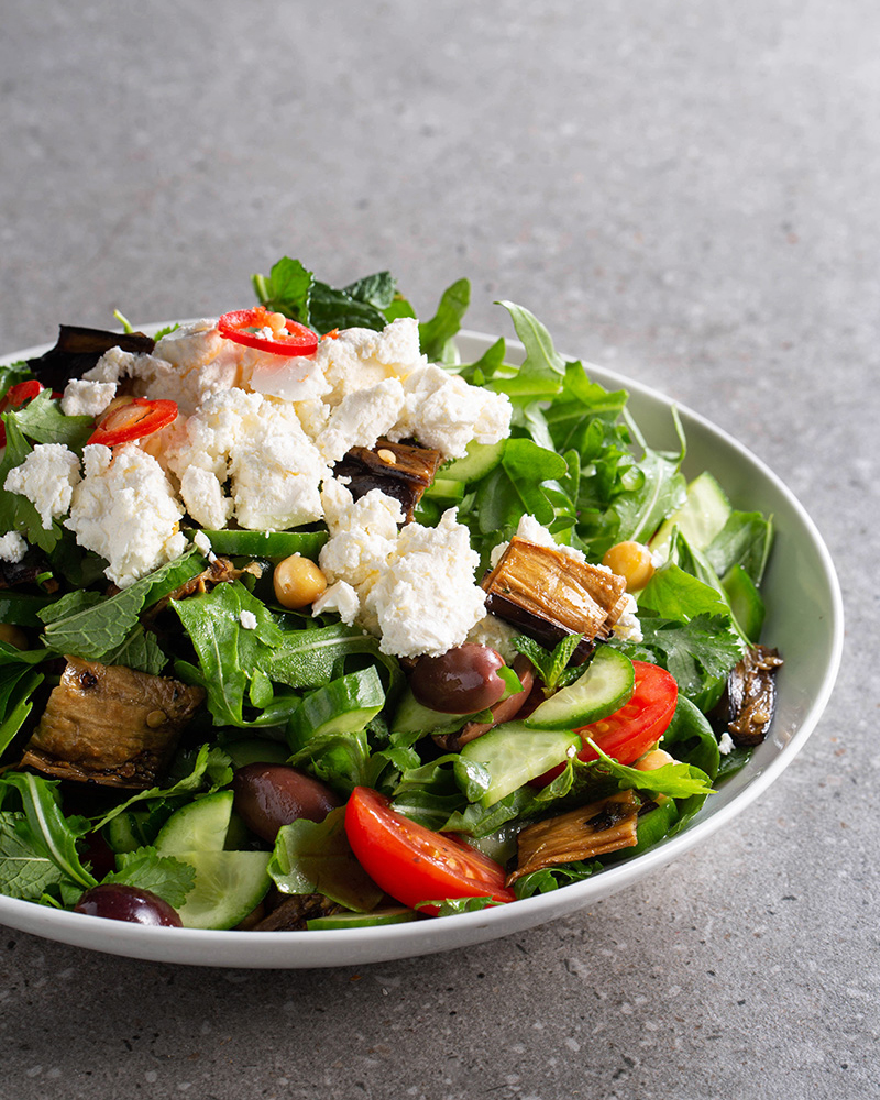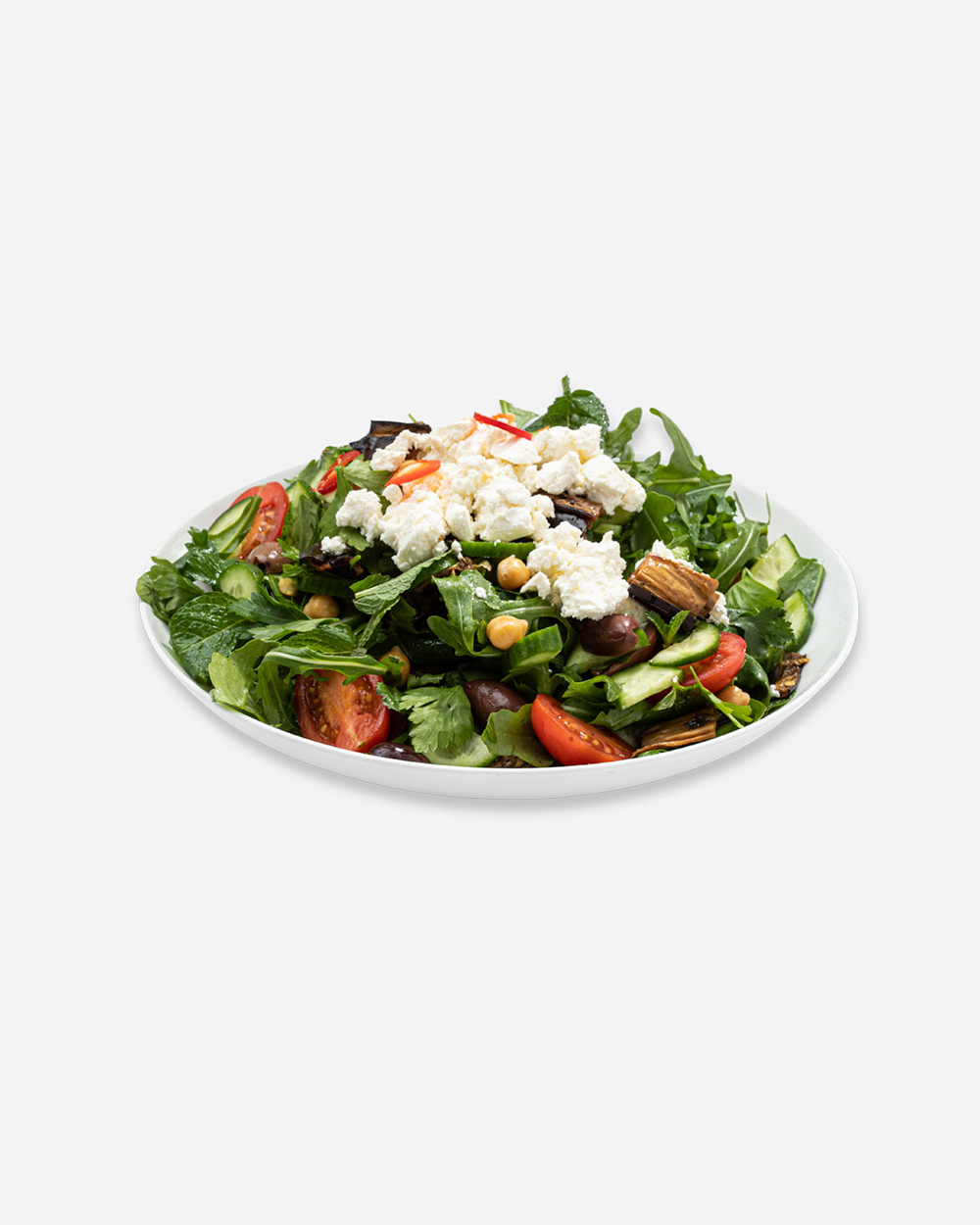 עגבניות שרי, מלפפון, גרגרי חומוס, חציל קלוי, גבינה בולגרית, זיתי קלמטה, עלי רוקט, עלי נענע, עלי פטרוזיליה, עלי כוסברה, סומק, פלפל צ’ילי בוינגרט שמן זית ולימון.