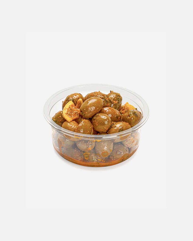 רכיבים: זיתים ירוקים (60%), מיץ לימון, שמן קנולה מזוכך, לימון, פלפל ירוק חריף, כוסברה, קארי, שמן זית, פטרוזיליה, פפריקה מתוקה, כורכום.