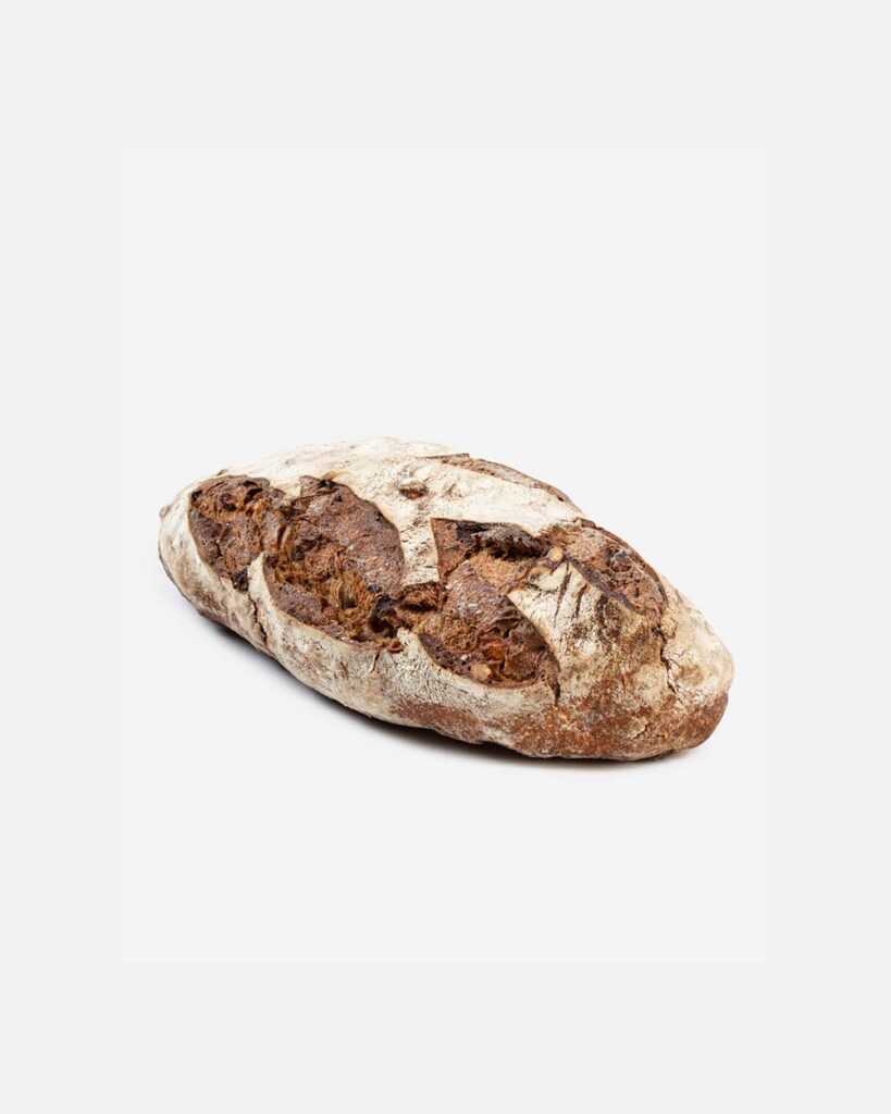 לחם צרפתי על בסיס מחמצת עם תערובת עשירה של אגוזים וצימוקים, מכיל : קמח מלא, קמח לבן, מחמצת. הולך מצוין עם גבינות איכותיות.