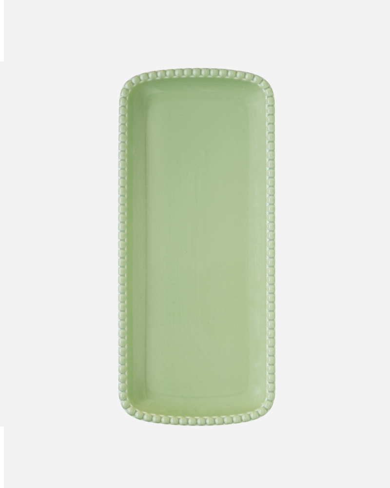 צלחת הגשה פורצלן מלבנית מעוטרת בצבע לבן/אפור/ירוק בהיר.