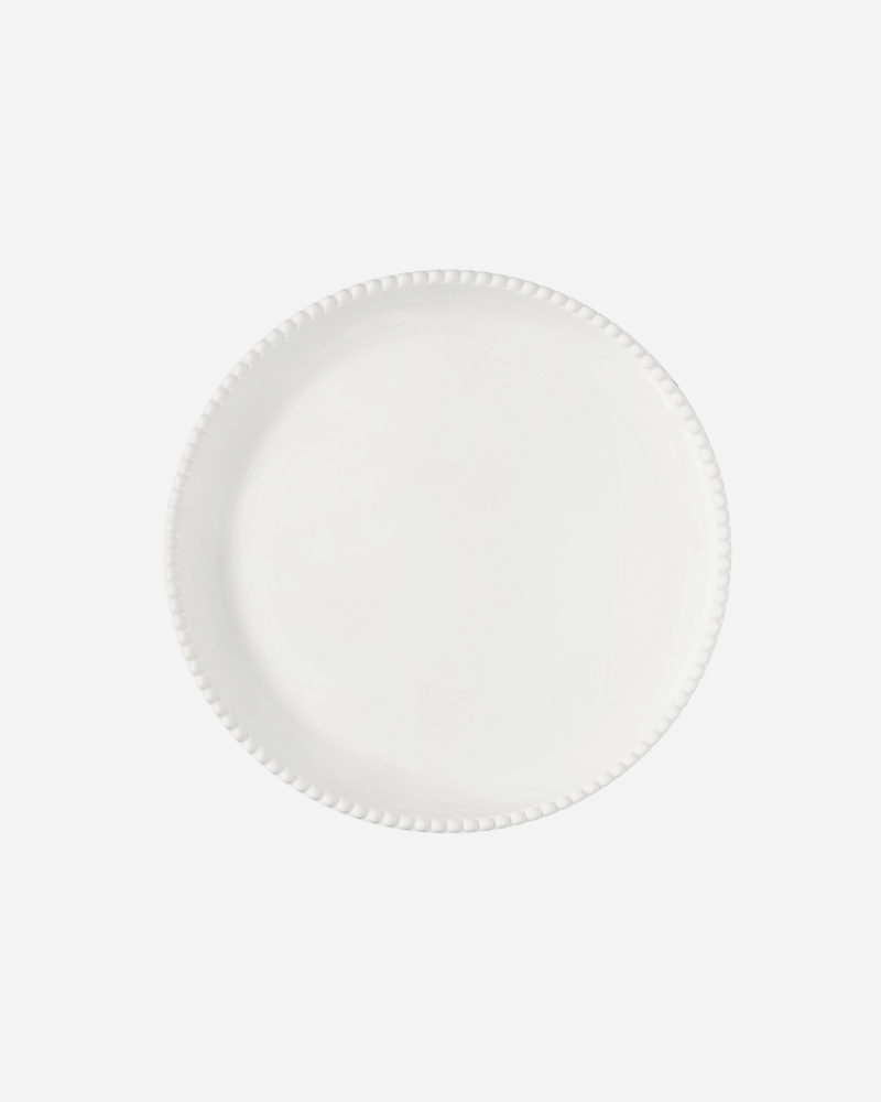 צלחת הגשה מפורצלן, עגולה מעוטרת בצבע לבן.